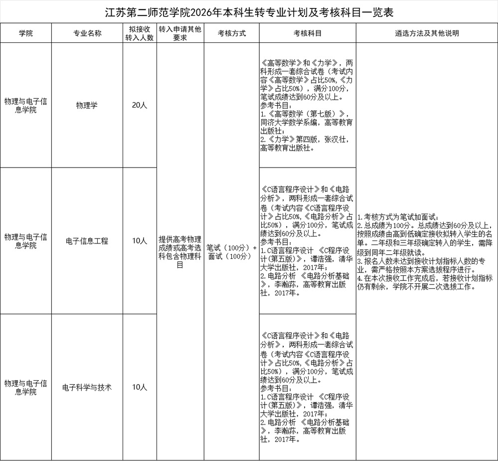 根据《江苏第二师范学院普通本科生转专业实施办法》(江苏二师教〔2024〕2号)文件精神及《江苏第二师范学院2026年普通本科生转专业工作方案》的要求,经研究,物理与电子信息学院2026年接收转专业工作方案如下: